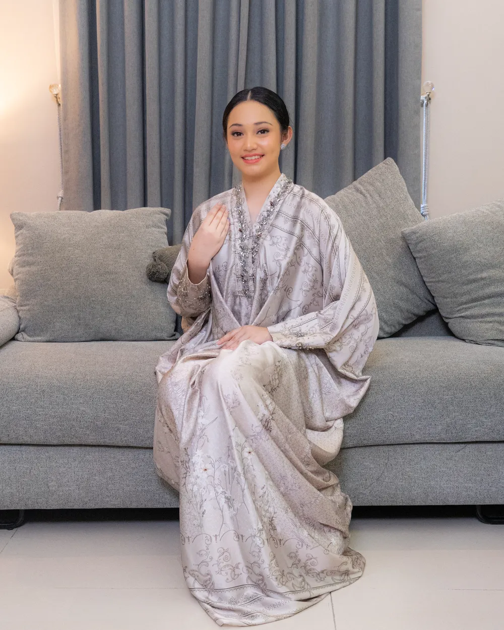 - Desain Chic & Elegan: Potongan kaftan long sleeves dengan v-neckline yang anggun, memberikan siluet tubuh yang indah dan nyaman.