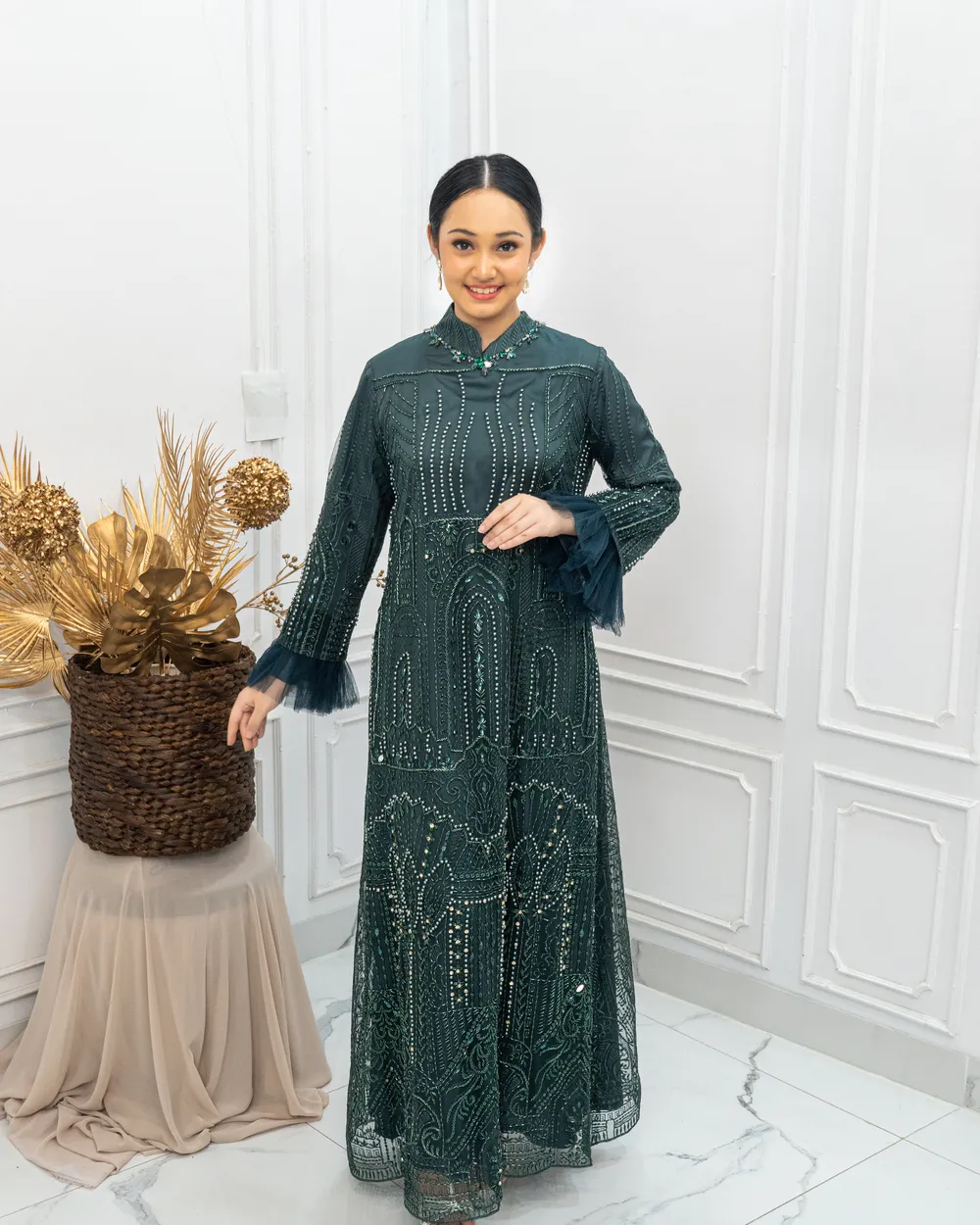 - Desain Chic & Modern: Potongan A-line yang anggun dengan sentuhan kerah Mandarin (Mandarin collar) yang stylish.