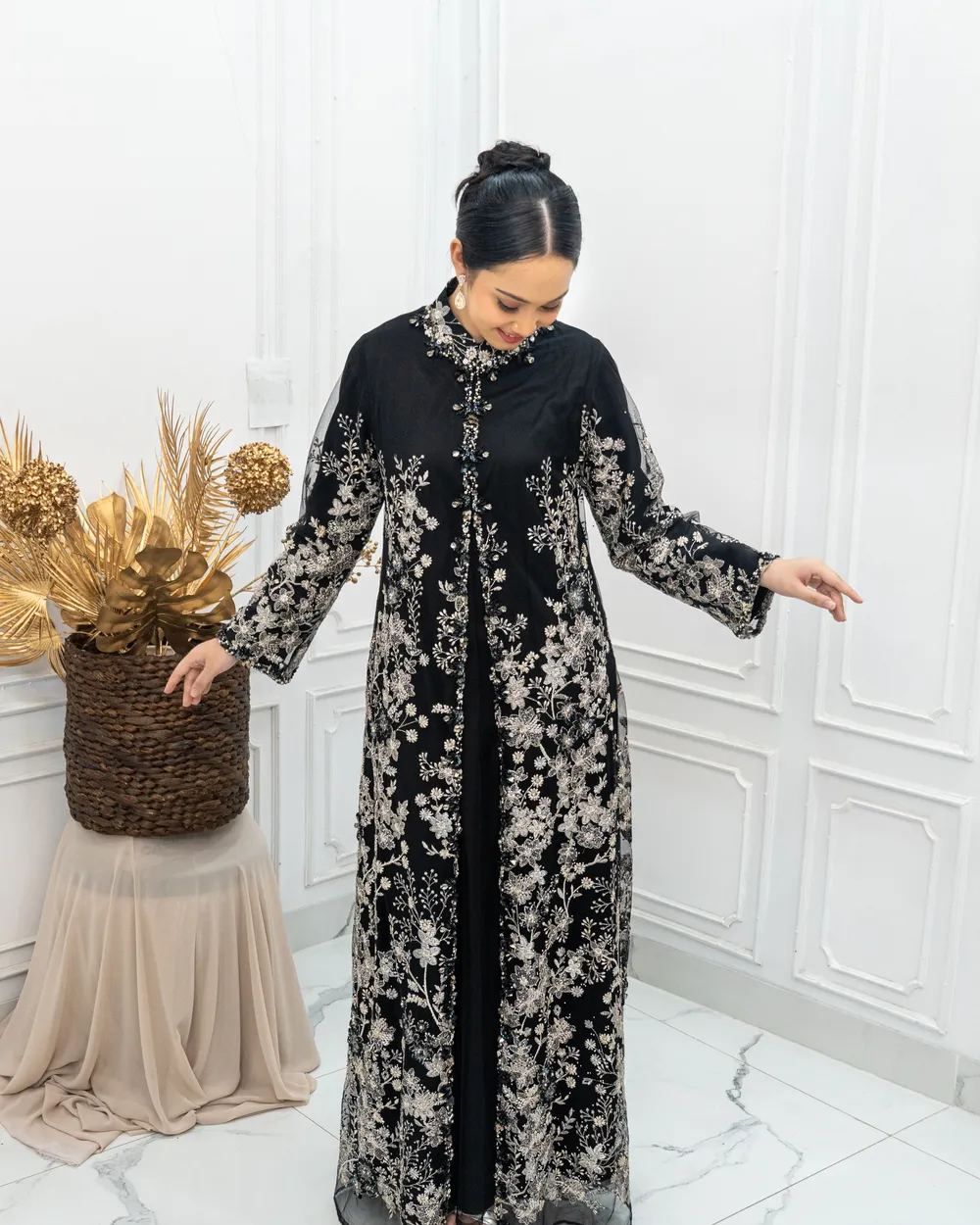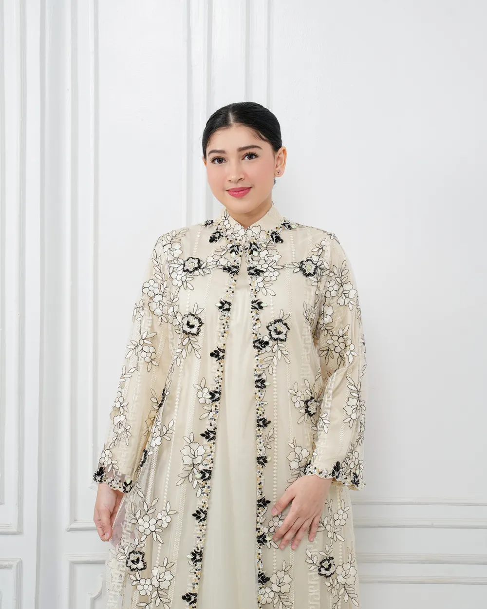 • Long Sleeves Outer: Outer yang sangat anggun dengan bahan tile bordir premium. Dilengkapi kerah Mandarin yang klasik, penutup snap on button, dan dihiasi aksen handmade beads yang dipayet secara manual (pada varian tertentu) untuk sentuhan eksklusif dan mewah.